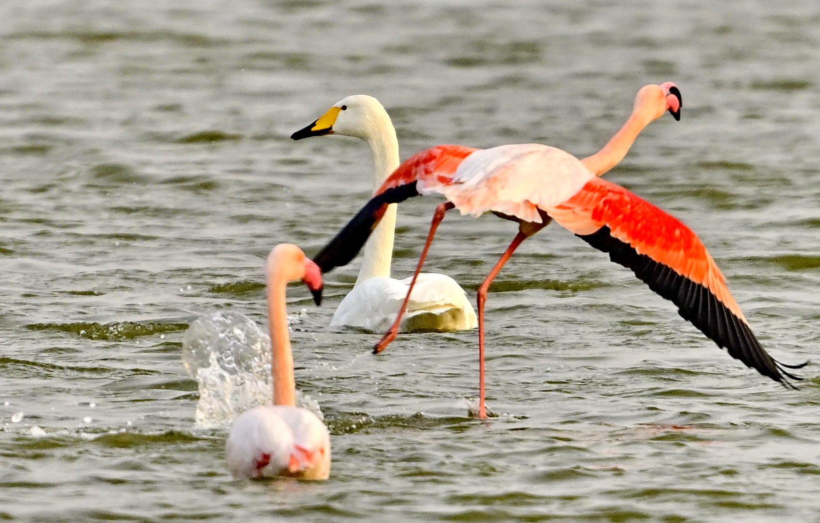 2月6日,运城盐湖湖面波光粼粼,中条山倒映在水中。一群身披粉羽的火烈鸟迈着修长玉腿悠然踱步觅食,与其共同戏水觅食的还有数十只洁白的大天鹅,天鹅与火烈鸟舒展羽翼、翩跹起舞,构成一幅令人沉醉的生态和谐画卷。 (杨冯彦 李淑霞)